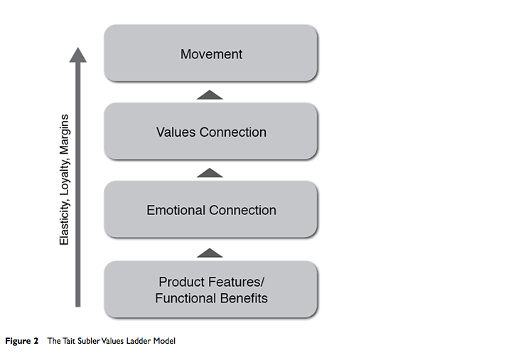 The brand model that initially drew Gucci to Tait Subler was the company’s values ladder model (see Figure 2). In the book The Mental World of Brands, Franzen and Bouwman describe the high degree to which a person’s values system influences the way they see themselves in relation to the rest of the world.3 Moreover, they cite various models from brain science that describe the way the brain structures meaning around the conception of things. They point out that the scientific models around structures of meaning have different levels in a means–ends hierarchy (as previously discussed), with the lowest levels being the concrete, superficial characteristics of a product (such as more horsepower or fresh ingredients); and the highest, most potent levels being those that relate to our feelings and ultimately, our values (as ends). For this reason, Tait Subler created an explicit ladder that pushes a brand toward an explicit statement of its ‘ends’ – otherwise known as its values or purpose. The goal is to articulate how a brand will work at each level of this ladder, and to push toward a values connection with its targeted consumers so that they see like ‘ends’ with the brand, and thereby become more deeply invested and loyal. Then for some brands, it is appropriate to frame the values in the context of how a brand wants to change the world, or the movement it wants to own. This idea of a movement as a highly powerful brand strategy is well described in Mark Earls’ book Welcome to the Creative Age, where he shows that what he calls a ‘purpose idea’ can make a greater impact both on consumers and internally at organisations.4