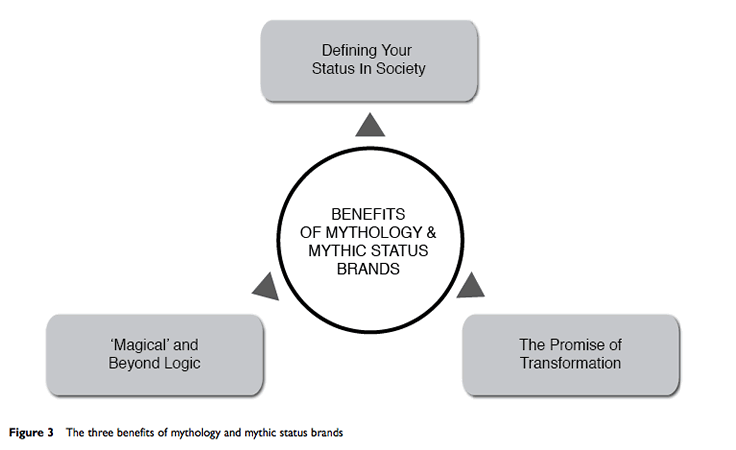 So, like mythology, mythic status brands promise to help a person find their place in society and to enhance it through some sort of transformation. People perceive their personal reality differently because they use brands to tell others who they are and where they fit in society. More importantly, they use (some) brands to change the way they see themselves. While the idea of status led us to mythology, we found that in fact, mythology (and mythic brands) provide three great benefits, only one of which is status.The second is the transformation into something more ‘god-like’, and the third is the idea that one can suspend logic and believe in some magical quality in life (see Figure 3).