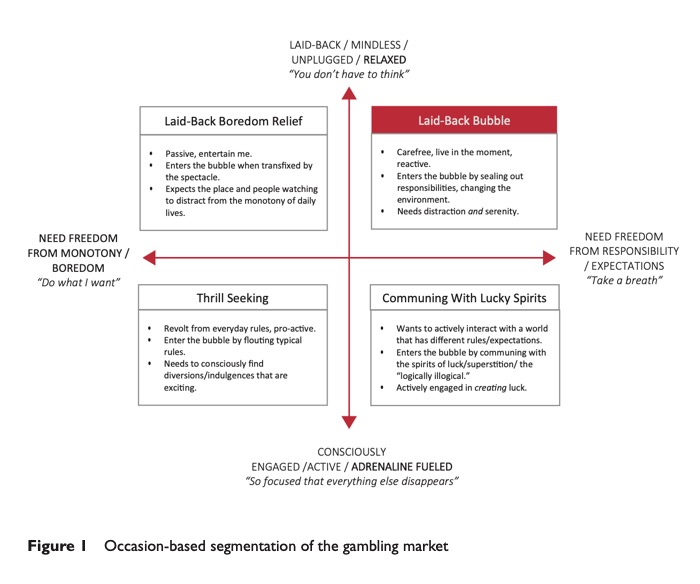 Far from excitement and thrill, this was akin to Corona’s relaxation beer moment in gambling. Our conclusion: an occasion-based segmentation model (Figure 1) makes sense in this category … and all the competitors (category convention) are focused on only one of the occasions (thrill and excitement).