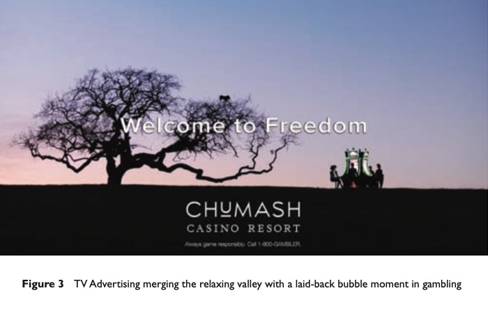 Marketing communications stood in stark contrast to the loud, fast and adrenaline-soaked efforts of San Manuel and others. There was no ‘win and grin’, and it was shot as point of view or from behind models so that it focused on the ‘bubble moment’ rather than a type of person.The parallel between the laid-back beauty of the valley and the sanctuary sought by guests in their gambling bubble was brought to life in unusual advertising that brought gambling moments outside into the nature of the valley (Figure 3).