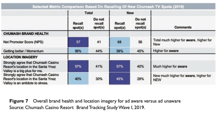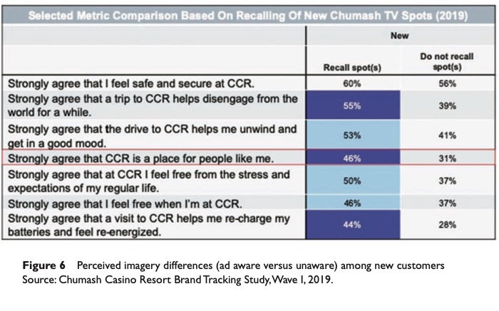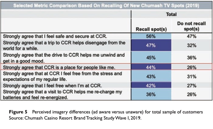 A brand tracking study was designed to measure how well Chumash Casino Resort was taking ownership of this laid-back bubble moment in the minds of gamblers in the expanded and contested market towards LA (Figure 4). The first wave of tracking was fielded after media expenditures had reached only 50 per cent of respondents. This allowed for a great opportunity to see the perceptual differences between those who saw the ads and those who did not (Figure 5).